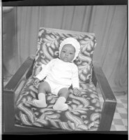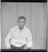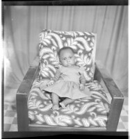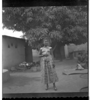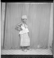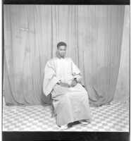 A woman wearing a dress and a necklace sitting profile view in front of a man wearing a white suit, a tie, and glasses, who is standing full frontal view in front of two men, one of whom is wearing pants and a shirt, the other is wearing a military unifo