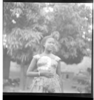A photograph of a group of 4 people, two of whom are girls wearing dresses and two of whom are men wearing suits, all standing profile view in the studio.