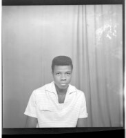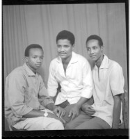 A boy who is wearing a shirt and shorts is sitting full frontal view in front of two other boys: one who is wearing a shirt and shorts and the other who is wearing a shirt and pants; both are sitting full frontal view in the studio.