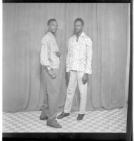 398. EAP449/2/19/398 Reference (shelfmark): EAP449/2/19/398 Title: Two men wearing shirts and pants, standing profile view in the studio. Collection Area: Endangered Archives Programme Languages: Not applicable Date Range: 2nd half od the 20th century Extent: 1 TIFF image