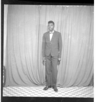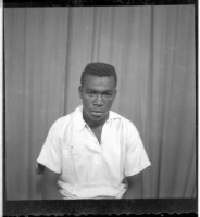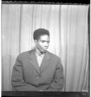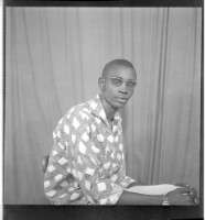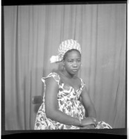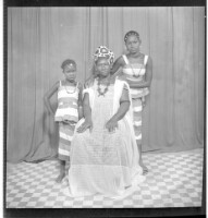 A woman wearing a dress, headscarf, and necklaces, sitting full frontal view in front of two girls wearing robes pagnes (wrapper dresses) and necklaces, standing full frontal view in the studio.