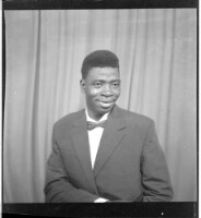 Three men, one of which is wearing a suit and two are wearing shirts and pants; one is sitting full frontal view and two are sitting profile view in the studio.