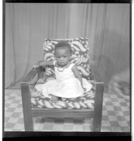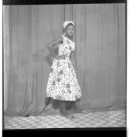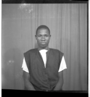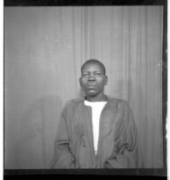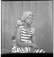 A man is wearing a shirt, a tie, and pants, sitting full frontal view in front of a woman who is wearing a robe pagne (wrapper dress), headscarf, and necklaces sitting full frontal view on a motorcycle in the studio.