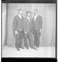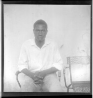 A photograph of 5 men: 3 men in front, one of whom is wearing a shirt and pants, sitting full frontal view , and two wearing boubous, sitting profile view; and behind 2 men wearing boubous and hats, one of whom is wearing glasses, standing full frontal vi