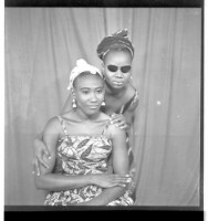 Two women are wearing dresses and head scarves; one of them is wearing sunglasses and leaning full frontal view over the other who is sitting full frontal view in the studio.