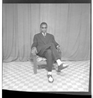 Two girls wearing pagne dresses ( wrapper dresses) and necklaces are sitting full frontal view in front of two men who are wearing shirts and pants; one of who is wearing a hat. All of them are facing full frontal view in the studio.