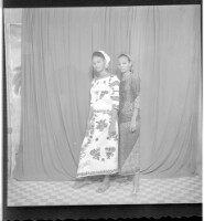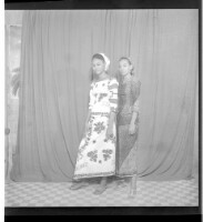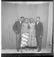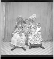 Two girls wearing dresses, headscarves, and chain necklaces, standing full frontal view in the middle of two men wearing suits and ties, standing profile view in the studio.