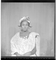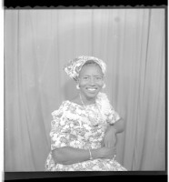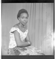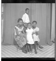 Three girls, two of whom are wearing dresses and sitting full frontal view, and one who is wearing a tank top and pagne (wrapper), sitting profile view in front of a man, standing profile view in the studio.