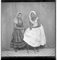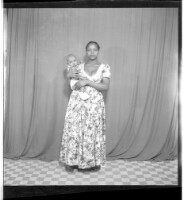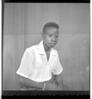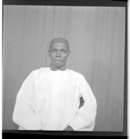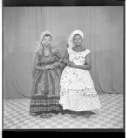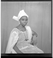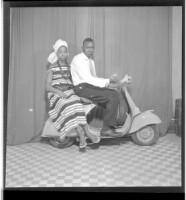 A man wearing a shirt, tie, and pants, sitting full frontal view in front of a woman wearing a robe pagne (wrapper dress), headscarf, and necklaces, sitting full frontal view, both on a motorbike.