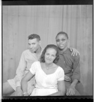 A woman wearing a tank top, skirt, and chain necklace, sitting profile view in front of two men wearing shirts; one of whom is wearing glasses and pants, while the other is wearing shorts. All are sitting profile view in the studio.
