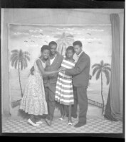 593. EAP449/2/19/593 Reference (shelfmark): EAP449/2/19/593 Title: Two girls wearing dresses and two men wearing suits, all standing profile view in the studio. Collection Area: Endangered Archives Programme Languages: Not applicable Date Range: 2nd half od the 20th century Extent: 1 TIFF image