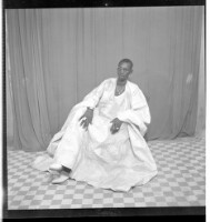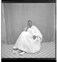 596. EAP449/2/19/596 Reference (shelfmark): EAP449/2/19/596 Title: A man wearing a loose boubou and sunglasses is sitting full frontal view in the studio. Collection Area: Endangered Archives Programme Languages: Not applicable Date Range: 2nd half od the 20th century Extent: 1 TIFF image