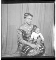 597. EAP449/2/19/597 Reference (shelfmark): EAP449/2/19/597 Title: A women wearing a dress, headscarf, and chain necklace, sitting profile view while holding a baby on her lap in the studio. Collection Area: Endangered Archives Programme Languages: Not applicable Date Range: 2nd half od the 20th century Extent: 1 TIFF image