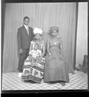 599. EAP449/2/19/599 Reference (shelfmark): EAP449/2/19/599 Title: Two women wearing dresses, headscarves, and necklaces, sitting full frontal view, one of whom holding a baby on her lap in front of a man wearing a suit, tie, and glasses, standing full frontal view in the studio. Collection Area: Endangered Archives Programme Languages: Not applicable Date Range: 2nd half od the 20th century Extent: 1 TIFF image