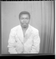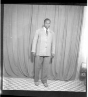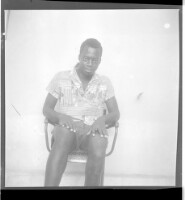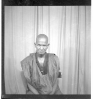 A woman wearing a loose dress, a headscarf, and necklace, sitting full frontal view with a baby on her lap; at her sides are two boys wearing shirts and shorts, both standing full frontal view; behind are two girls wearing dresses, headscarves, and neckla