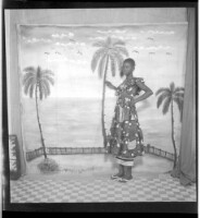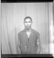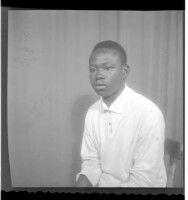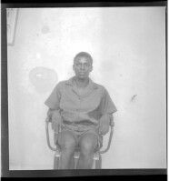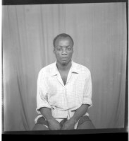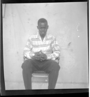 A man wearing a shirt and pants, sitting full frontal view with a child leaning on his lap. At his sides are a boy wearing shorts and a shirt, standing full frontal view and a little girl wearing a dress and a skirt, standing profile view in between two g