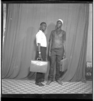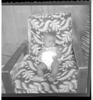A man wearing a shirt and pants, sitting full frontal view with a child leaning on his lap. At his sides are a boy wearing shorts and a shirt, standing full frontal view, and a little girl wearing a dress and a skirt, standing profile view in between two