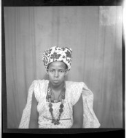 666. EAP449/2/19/666 Reference (shelfmark): EAP449/2/19/666 Title: A woman wearing a dress, a headscarf, and necklaces. Sitting full frontal view in the studio. Collection Area: Endangered Archives Programme Languages: Not applicable Date Range: 2nd half od the 20th century Extent: 1 TIFF image