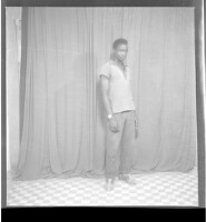 670. EAP449/2/19/670 Reference (shelfmark): EAP449/2/19/670 Title: A man wearing a t-shirt and pants, standing profile view in the studio. Collection Area: Endangered Archives Programme Languages: Not applicable Date Range: 2nd half od the 20th century Extent: 1 TIFF image