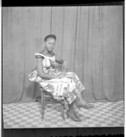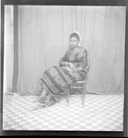 684. EAP449/2/19/684 Reference (shelfmark): EAP449/2/19/684 Title: A girl wearing a robe pagne (wrapper dress) and headscarf, sitting profile view in the studio. Collection Area: Endangered Archives Programme Languages: Not applicable Date Range: 2nd half od the 20th century Extent: 1 TIFF image
