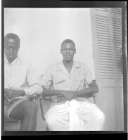 692. EAP449/2/19/692 Reference (shelfmark): EAP449/2/19/692 Title: Two men wearing shirts, one who whom is wearing shorts and sitting profile view while the other is wearing pants and sitting full frontal view behind a door. Collection Area: Endangered Archives Programme Languages: Not applicable Date Range: 2nd half od the 20th century Extent: 1 TIFF image