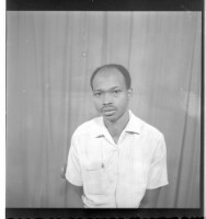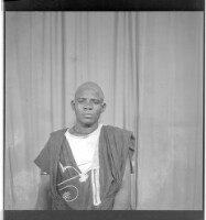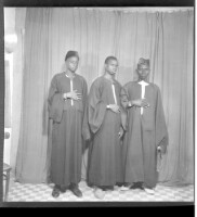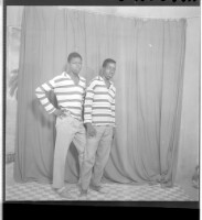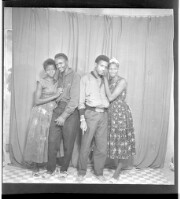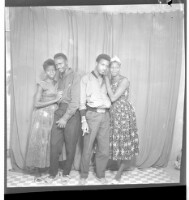 Two girls wearing dresses, one standing full frontal view and the other standing profile view, each holding a man wearing a shirt and pants, standing profile view in the studio.