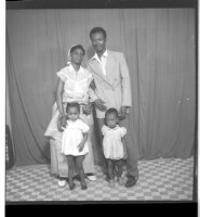 739. EAP449/2/19/739 Reference (shelfmark): EAP449/2/19/739 Title: Two little girls wearing dresses, standing full frontal view in front of a man wearing a jacket and pants, standing full frontal view, next to a woman wearing a robe pagne (wrapper dress) and a headscarf, standing profile view in the studio. Collection Area: Endangered Archives Programme Languages: Not applicable Date Range: 2nd half od the 20th century Extent: 1 TIFF image