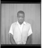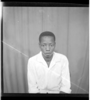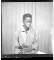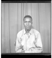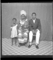 Full family portrait of four people, a woman sitting wearing a full camisole and a head scarf, a necklace, and earrings, holding a baby wearing a black shirt and a smile, to the left a little girl standing and a man sitting to the right wearing a shirt