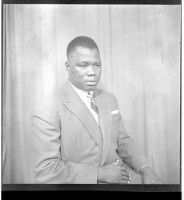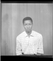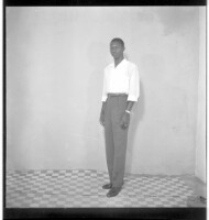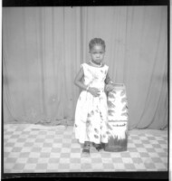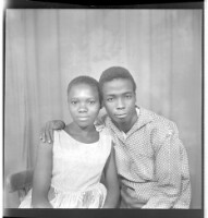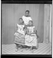 Full portrait of three young people, a young man standing, wearing a t-shirt and two young girls sitting, to the left one is wearing a camisole and a long cloth and to the right one is wearing a dress, a necklace, earrings, and a hairstyle, facing forwar