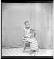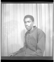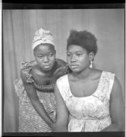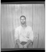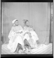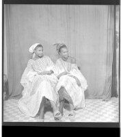 Copy of two men, one sitting wearing a white boubou, a watch, and a black fez with crossed arms, standing a man wears a black boubou, a bone, and a watch, facing forward