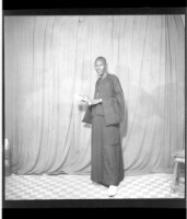 Full portrait of four people, a woman sitting wearing a camisole and a loincloth, a head scarf, and a necklace, arms crossed, to the right a man standing wearing a white shirt and black pants, to the left a young girl is standing behind a child also stand