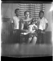Copy of full portrait of four people, a woman sitting wearing a black dress, holding a baby wearing white and two little boys wearing the same shirt and under shorts over pants, facing forward