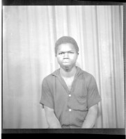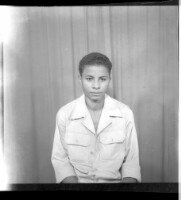 Copy of a couple, a young man sitting wearing a white shirt and a grey suit, a young girl standing wearing a camisole, a white necklace, and a white head scarf facing forward