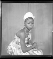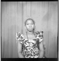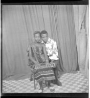 Full portrait of a couple, a young man sitting wearing a white shirt with a young girl sitting wearing a camisole, a black loincloth, a necklace and a head scarf, facing forward