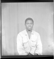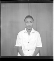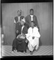 Full portrait of four people, two men standing wearing black boubous and two sitting one wearing a white boubou and the other a black boubou, facing forward