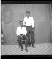 Two young men, one sitting wearing a white shirt, black pants and black shoes, the other man standing wearing a white long sleeve shirt, black shoes, black pants, facing forward