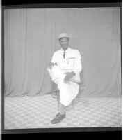 Full portrait of two men standing wearing the same shirt and pants, the one on the left is wearing a hat and the one on the right is wearing a bone, facing forward