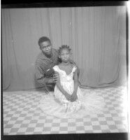 Full portrait of two people in the foreground, a little girl kneeling on the ground wearing a white dress and a hairstyle, being held by a man wearing a grey shirt, facing forward