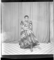 228. EAP449/2/20/228 Reference (shelfmark): EAP449/2/20/228 Title: Full portrait of a woman sitting on a chair, wearing a black dress, a hairstyle, earrings, and a necklace, arms and legs crossed, facing forward Collection Area: Endangered Archives Programme Languages: Not applicable Date Range: 2nd half od the 20th century Extent: 1 TIFF image