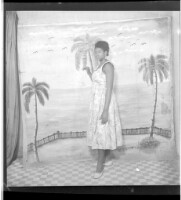 252. EAP449/2/20/252 Reference (shelfmark): EAP449/2/20/252 Title: Full portrait of a young girl wearing a grey dress in front of a curtain with three palm trees, facing sideways Collection Area: Endangered Archives Programme Languages: Not applicable Date Range: 2nd half od the 20th century Extent: 1 TIFF image