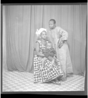 311. EAP449/2/20/311 Reference (shelfmark): EAP449/2/20/311 Title: Full portrait of a woman sitting, wearing a dress and a head scarf, holding a baby wearing black, and a man standing wearing a watch, facing forward Collection Area: Endangered Archives Programme Languages: Not applicable Date Range: 2nd half od the 20th century Extent: 1 TIFF image
