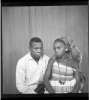 312. EAP449/2/20/312 Reference (shelfmark): EAP449/2/20/312 Title: A couple, a man sitting, wearing a white shirt with a woman wearing a camisole, a necklace, earrings and a head scarf, facing forward Collection Area: Endangered Archives Programme Languages: Not applicable Date Range: 2nd half od the 20th century Extent: 1 TIFF image
