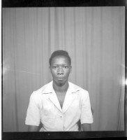 315. EAP449/2/20/315 Reference (shelfmark): EAP449/2/20/315 Title: Full portrait of a young girl standing wearing a white dress, a hairstyle and a head scarf, her arm on her hip and standing in front of a curtain with three palm trees, facing forward Collection Area: Endangered Archives Programme Languages: Not applicable Date Range: 2nd half od the 20th century Extent: 1 TIFF image