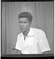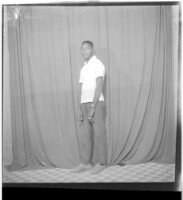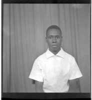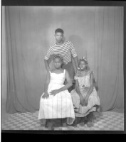 Full portrait of three young people, two women are sitting wearing dresses, white and grey, and head scarves, a man is standing in the middle, facing forward