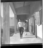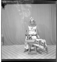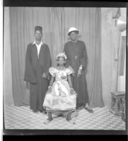 Full portrait of three people, a woman sitting in the middle, wearing a full dress and a head scarf, two men standing on either side of her, facing forward