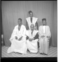 Full portrait of four men, three sitting, two wearing white and grey boubous, one standing wearing a white boubou, all wearing a fez, glasses and watches, facing forward