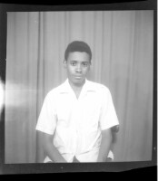Full portrait of two young white men, standing to the left one is wearing a white short sleeve shirt and to the right the other is wearing a white long sleeve shirt and a watch, facing forward