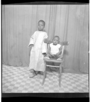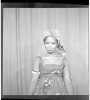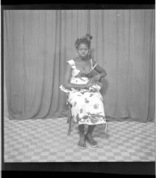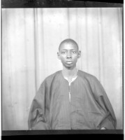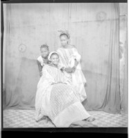 Full portrait of three women, one sitting on a chair wearing a white boubou, a white head scarf, a smile and earrings, one wearing a hairstyle and earrings, the one on the right is wearing a white boubou, a head scarf and earrings, facing forward