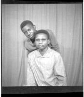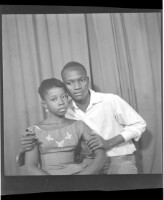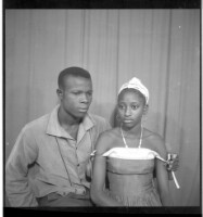A young couple, a young girl sitting, wearing a dress, earrings and a hairstyle, with a man wearing a white long sleeve shirt, holding hands facing forward