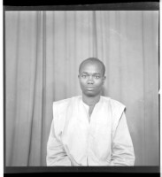Full portrait of two men sitting, to the left one wears a white boubou and a black fez, arms crossed, to the right a man wears a black boubou, a grey fez and a watch, arms crossed, facing forward